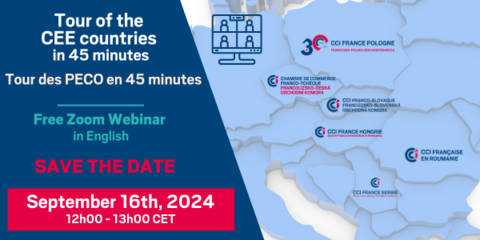 We are delighted to invite you to regional webinar we are organizing in cooperation with French Chambers of Commerce and Industry from the 6 Central and Eastern Europe region: Czech Republic, Hungary, Poland, Romania, Slovakia and Serbia. On 16.09.2024. at 12 PM, a webinar will be held on topic "Tour de CEE countries in 45 min".