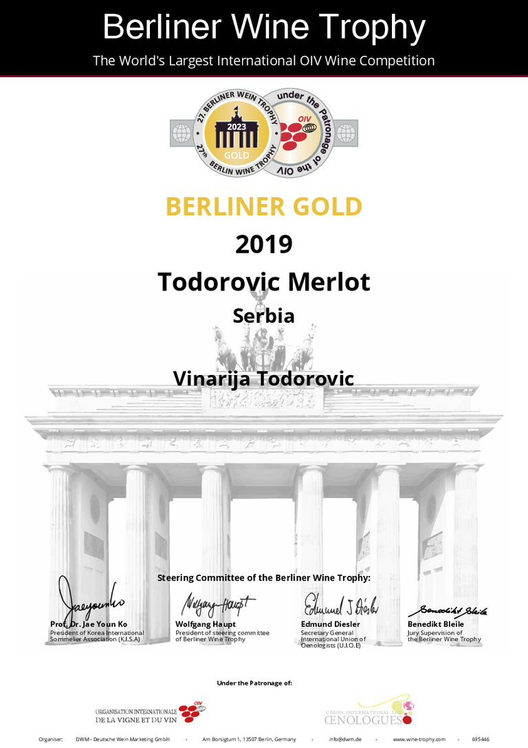 Les vins, Todorović Merlot 2019 et Todorović Cabernet Sauvignon 2019, ont remporté des médailles lors de la compétition Deutsche Wein Marketing / DWM.