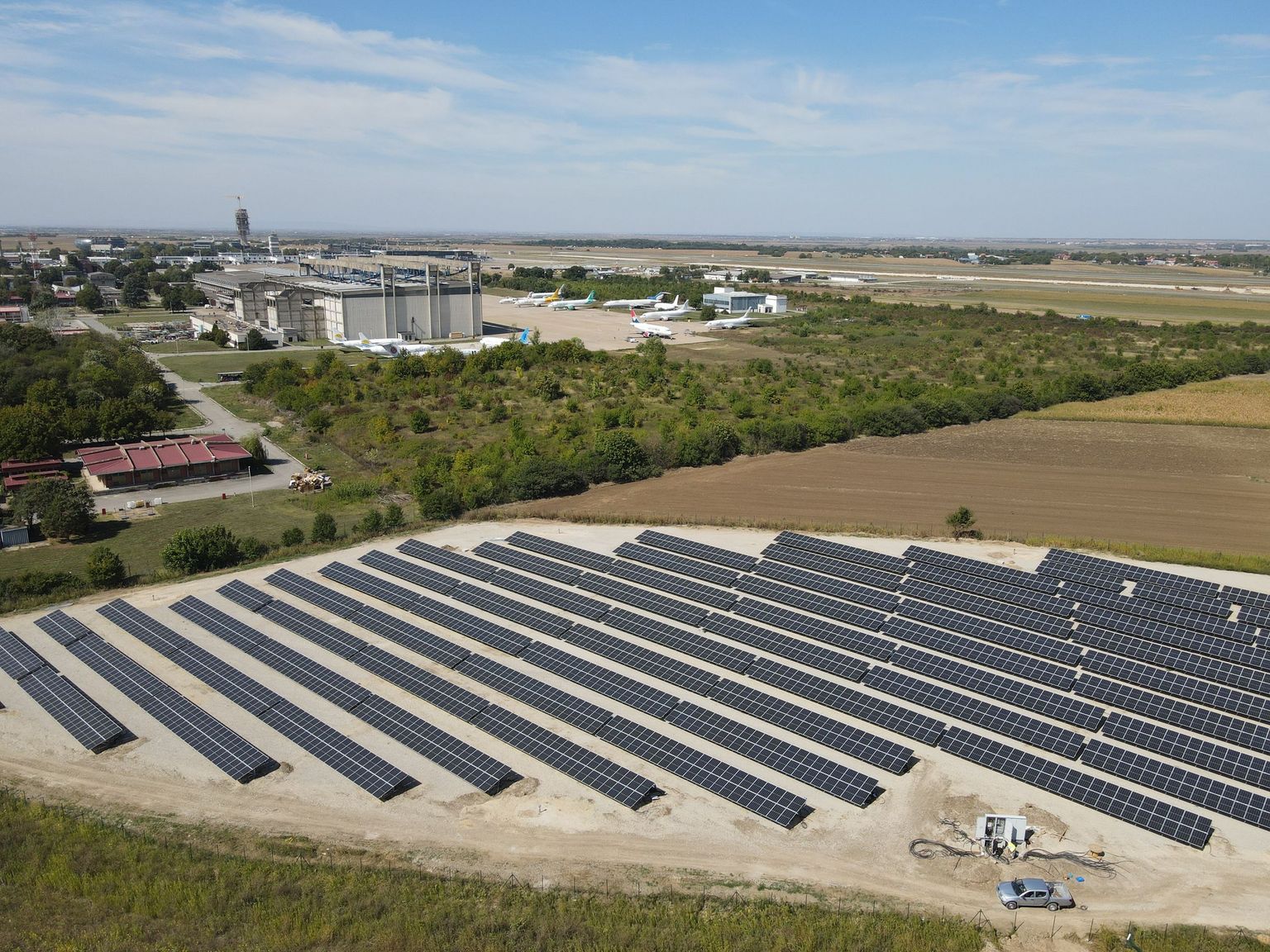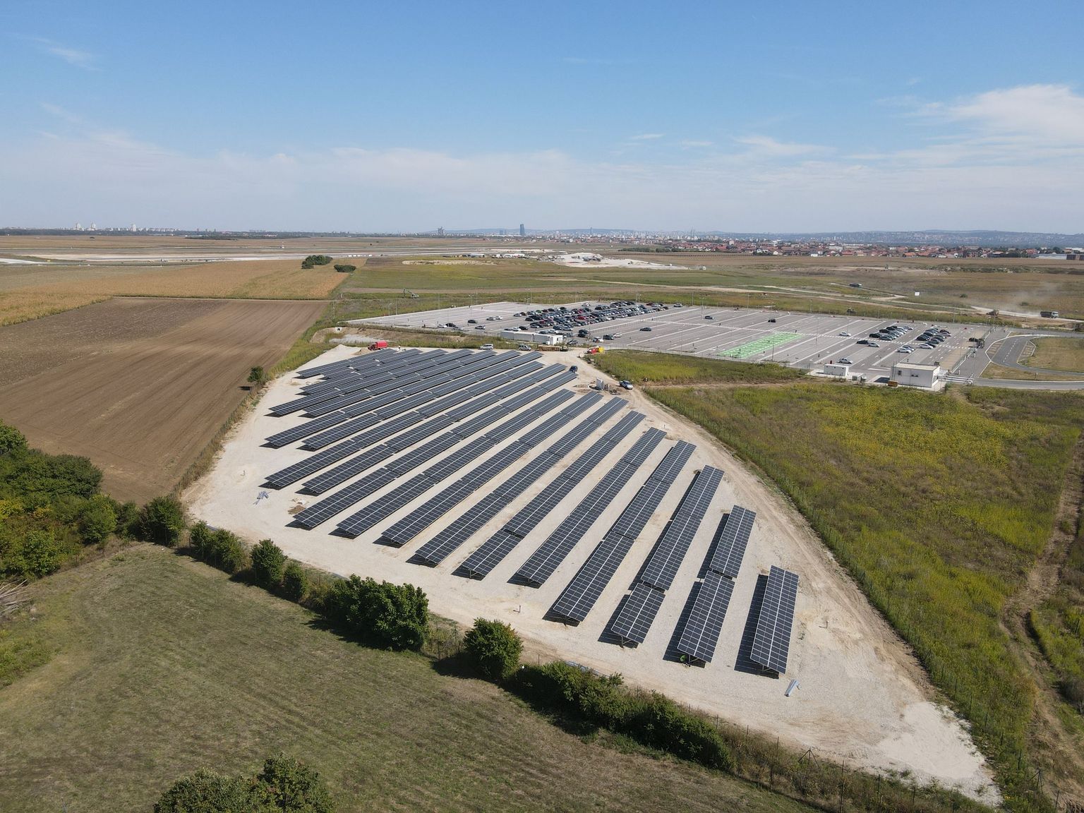 A photovoltaic solar system was built containing 2984 modules with an installed power of 1 MWp. The solar power plant provides the airport with electricity obtained from renewable sources and produces about 1,130,000 kWh of green electricity per year. The expected reduction of GHG emissions is approximately 10%. The value of the investment with the supplemental equipment is approximately 2.2 million EUR.