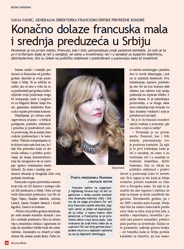 Magazin Biznis a interviewé la directrice de la CCIFS Sanja Ivanic sur les activités de la Chambre et les projets pour la 2019.