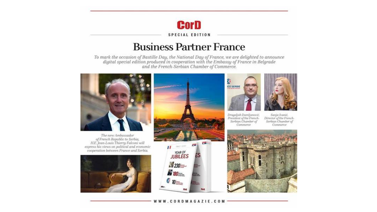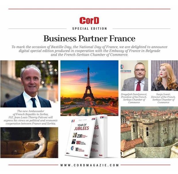 A l'occasion de la fête nationale de la France, notre membre Alliance international media a le plaisir d'annoncer une édition spéciale traditionnelle du magazine CORD, en coopération avec l'ambassade de France et notre Chambre. L'ambassadeur de France, S.E. Jean-Louis Falconi, fera une revue spéciale de la coopération politique et économique entre la France et la Serbie dans son entretien introductif.