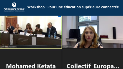 Dans le cadre du projet "Renforcement et perspectives de la coopération scientifique dans les Balkans occidentaux" financé par FEI (France Education Internationale) et le MEAE (Ministère de l'Europe et des Affaires Etrangères), un workshop, en forme hybride, s'est tenu à Bitola en Macédoine du Nord le 15 septembre 2022 sur le thème "Pour une éducation supérieure connectée". Notre directrice générale, Sanja Ivanic, a pris part à ce workshop en tant qu'intervenante et a répondu aux questions du modérateur sur les liens entre l'innovation, la recherche et le développement économique au sein des activités de la CCI France Serbie.