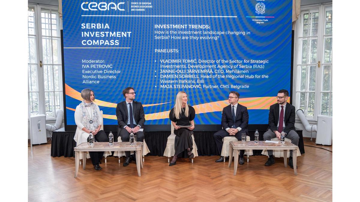 La conférence "Serbia Investment Compass" s’est tenue le 4 décembre à l’Ambassade d’Italie à Belgrade, organisée par le Conseil CEBAC. La conférence a réuni des dirigeants des institutions serbes et européennes, du corps diplomatique, du monde des affaires et du secteur financier, avec des discours d’ouverture prononcés par Silvija Rakić (CEBAC), l’ambassadeur de l’UE en Serbie Andreas Von Beckerath et l’ambassadeur d’Italie Luca Gori.