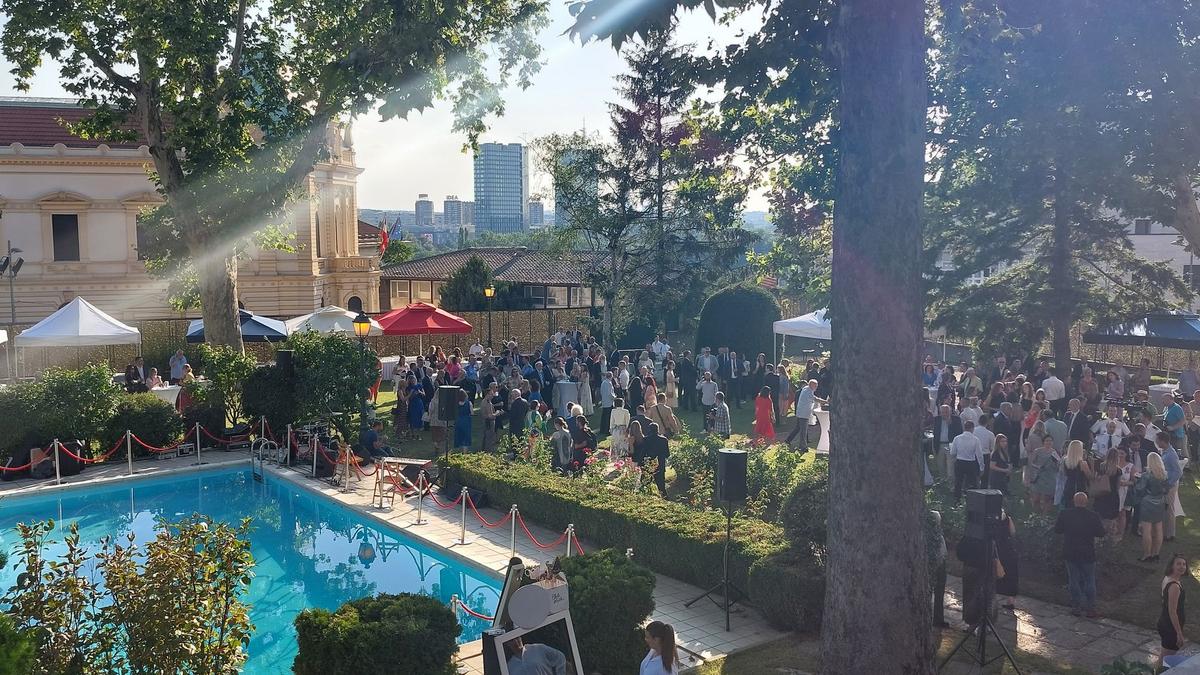 En soirée, dans les jardins de la résidence, une réception a eu lieu, organisée par l'ambassadeur Pierre Cochard et son épouse. Au début, les invités ont écouté les hymnes français, serbe et européen interprétés par Katarina Jovanović, une artiste renommée avec de nombreuses distinctions pour ses performances artistiques et son travail pédagogique, et qui entretient une grande amitié avec l'ambassade et l'État français.