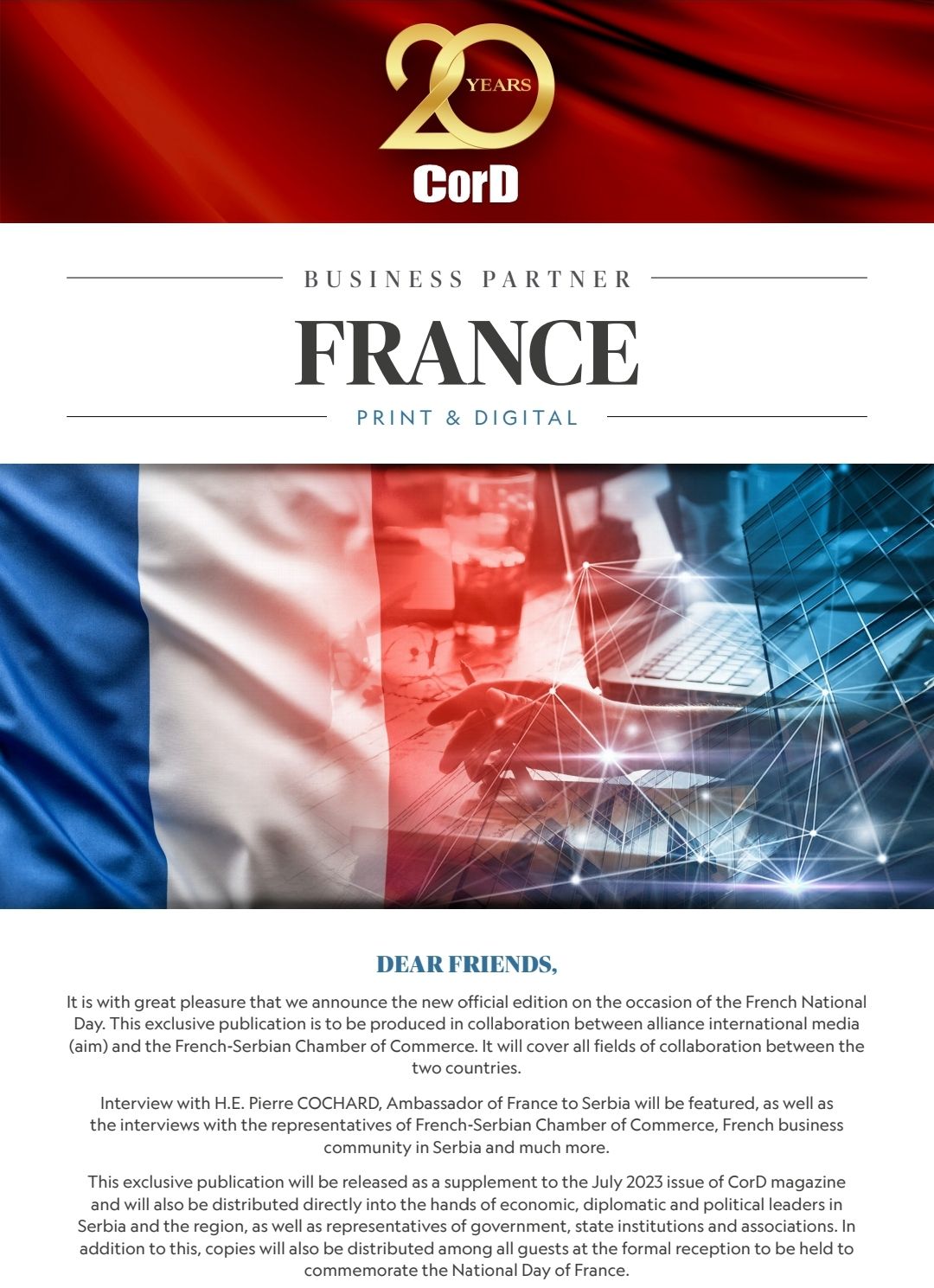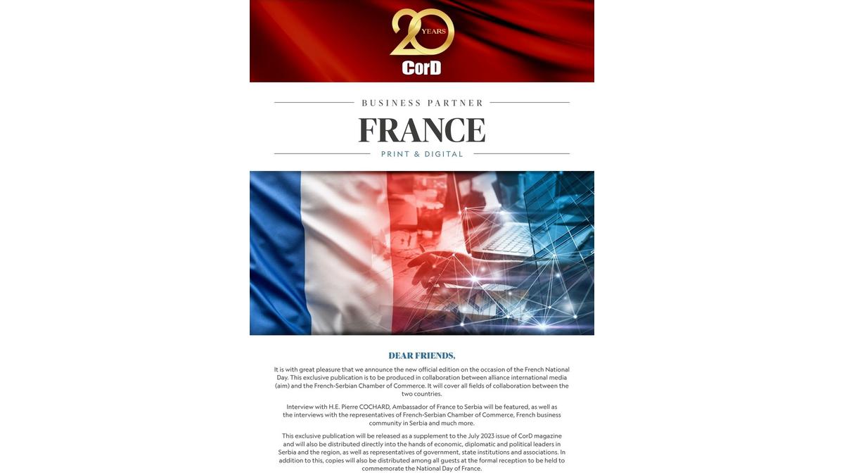 C'est l'année où notre membre, le magazine mensuel indépendant Cord, fête ses 20 ans d'activité. A l'occasion de la fête de la République en France, le 14 juillet, une édition spéciale du magazine est en préparation, qui couvrira des sujets liés aux relations bilatérales, économiques et politiques entre la Serbie et la France. Les lecteurs auront l'occasion d'en savoir plus sur la culture française, le tourisme et les activités en Serbie, ainsi que sur les investissements français, les plans et projets futurs.