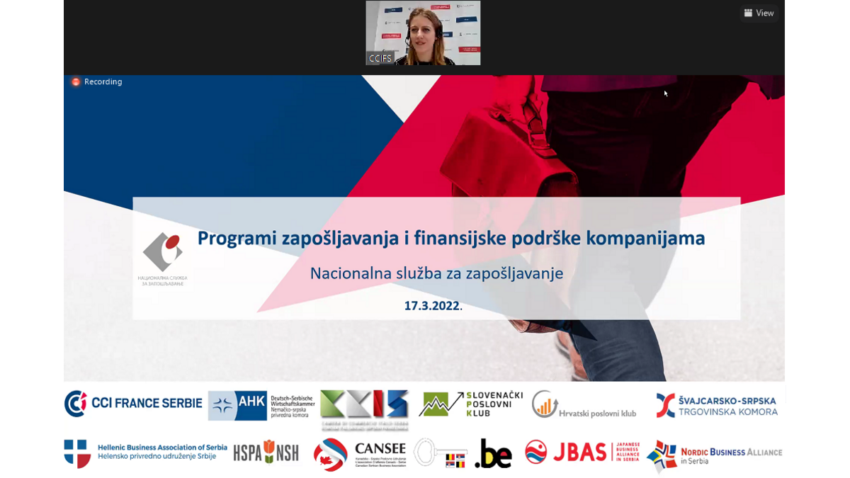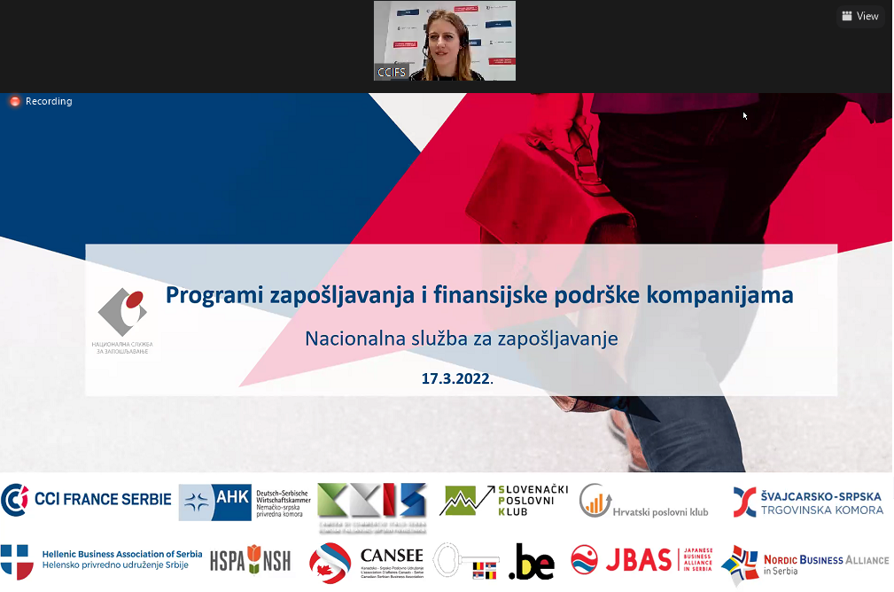 Le 17 mars, nous avons organisé avec succès une réunion en ligne de 12 associations professionnelles bilatérales en Serbie avec le Service national de l'emploi. Plus de 100 entreprises membres de l'association ont pu en savoir plus sur les programmes d'emploi en cours et le soutien financier aux entreprises.