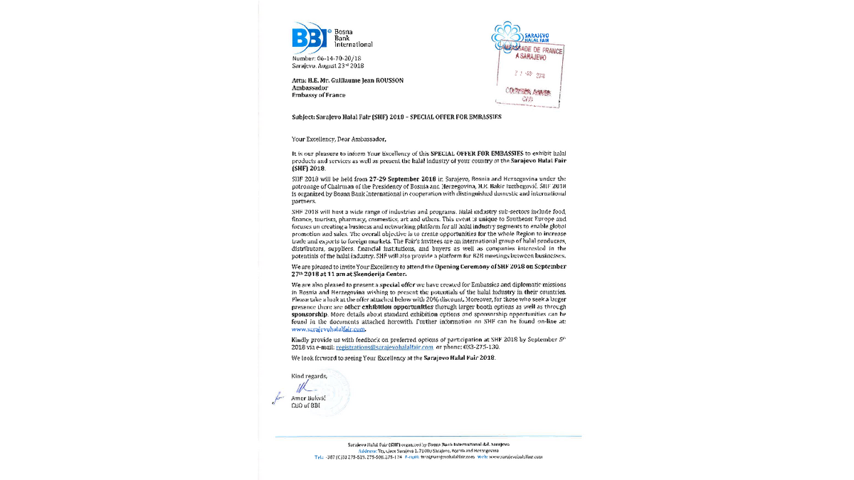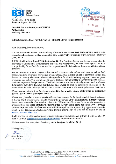 The Sarajevo Halal Fair (SHF) is an international halal industry exhibition that brings together representatives from all parts of the halal industry supply chain, including private companies, public listed corporations, accreditation bodies, government officials, and other halal market representatives.