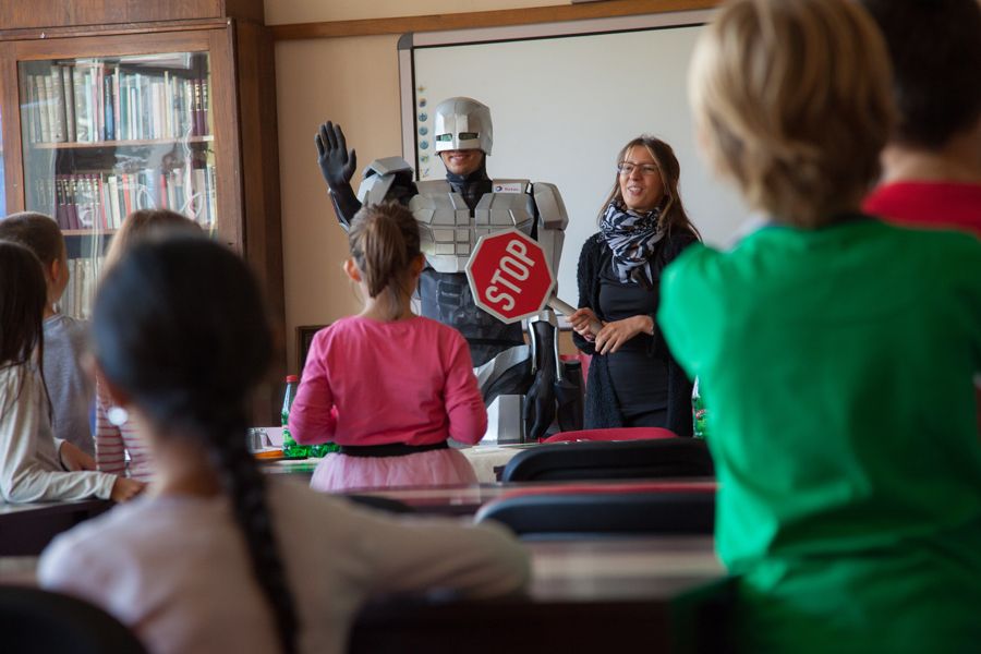 Through visual demonstration, question cards and ice-breaking games, the children are encouraged to express their views and opinions about certain situations that may happen on their way to school and back, to connect the situations with their own experiences and to conclude by themselves why a certain behavior in traffic is unsafe. To make the classes more fun and dynamic, we introduced Robot Quartz whom the children find absolutely thrilling. There is also a team of supervisors who are helping to handle large groups and making sure that every child takes part in the activities.
