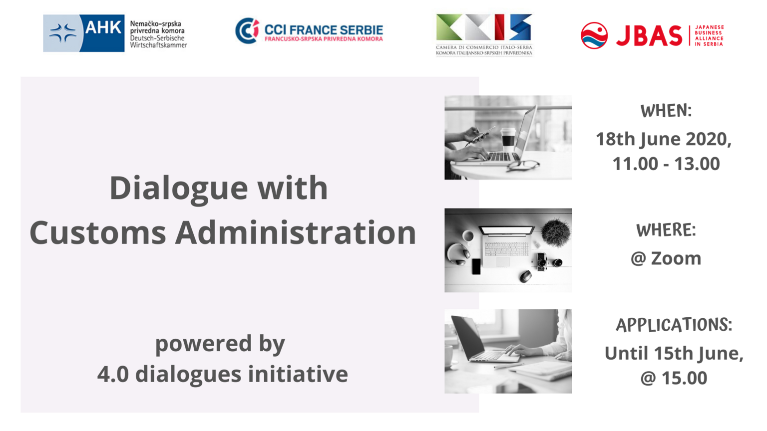 L'événement "Dialogue avec la Direction des douanes", sera organisé le jeudi 18 juin 2020, de 11h à 13h, via la plateforme Zoom. Nous organisons cet événement en coopération avec la Chambre de commerce italo-serbe (CCIS), l'Alliance d'affaires japonaise (JBAS) et la Chambre de commerce serbo-allemande (AHK) afin d'établir un dialogue continu entre les entreprises et les institutions officielles