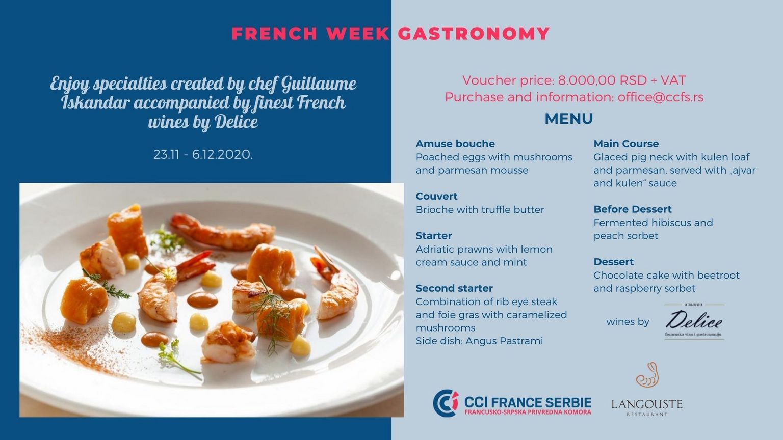 A partir de la semaine prochaine vous aurez l’occasion de déguster le menu créé spécialement pour la Semaine française au restaurant Langouste, partenaire de la semaine française cette année.