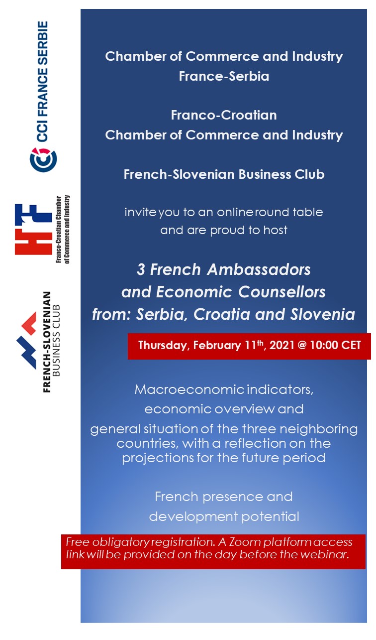 Le jeudi 11 février, nous organisons, en collaboration avec la CCI France - Croatie et le Club d'affaires franco-slovène, une table ronde pour discuter des différents états de la situation macroéconomique et de toutes les perspectives des trois marchés.