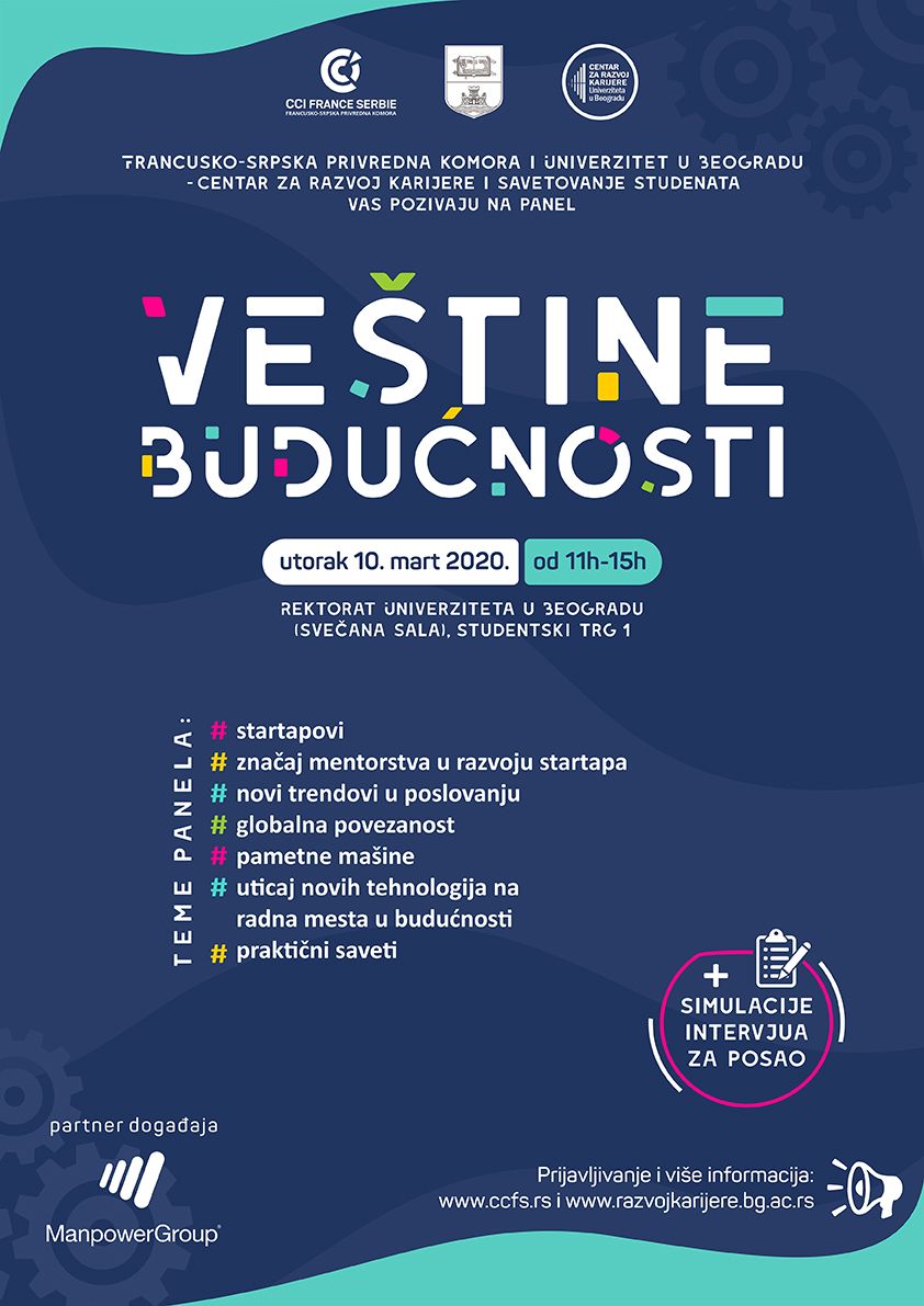La Chambre de commerce et d'industrie France Serbie et l'Université de Belgrade - Centre de développement des carrières et de conseil aux étudiants invitent les étudiants au Panel étudiant "Les compétences du futur" qui aura lieu le 10 mars prochain dans la Salle sollennelle du Rectorat de l'Université de Belgrade.