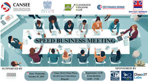La CCIFS, en collaboration avec CANSEE, l'Association d'affaires canado-serbe, le Club d'affaires slovène SPK, Confindustria Serbie et la Chambre de commerce britano-serbe (BSCC), vous invite à la nouvelle édition du Speed Business Meeting, soutenue par l'Hôtel Mona Plaza.