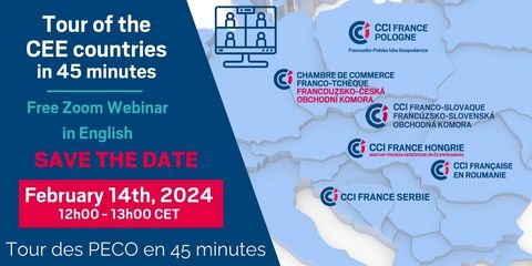 We are delighted to invite you to regional webinar we are organizing in cooperation with French Chambers of Commerce and Industry from the 6 Central and Eastern Europe region: Czechia, Hungary, Poland, Romania, Slovakia and Serbia. On 14.02.2024., a webinar will be held on topic "Tour de CEE countries in 45 min".