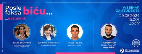 Nous vous invitons à assister au webinaire destiné aux étudiants "APRÈS LA FAC JE SERAI ENSEIGNANT", le mercredi 29 mai à partir de 15h sur l'application Zoom de la Chambre de Commerce Franco-Serbe.