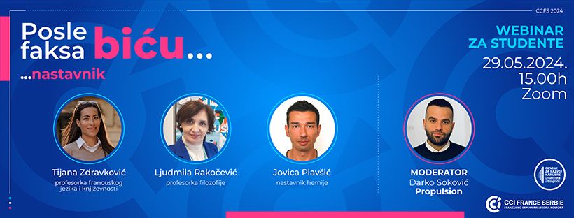 Nous vous invitons à assister au webinaire destiné aux étudiants "APRÈS LA FAC JE SERAI ENSEIGNANT", le mercredi 29 mai à partir de 15h sur l'application Zoom de la Chambre de Commerce Franco-Serbe.