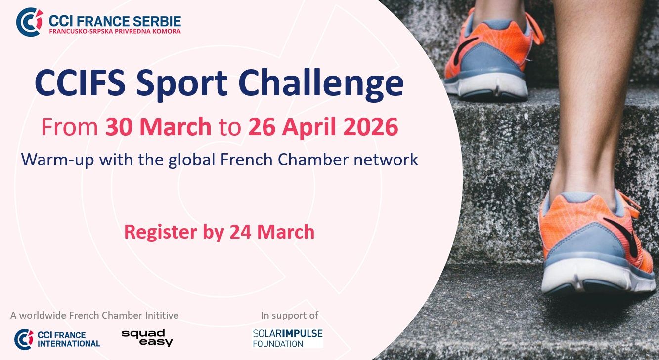 Želite li da promovišete benefite fizičke aktivnosti i angažovanje svojih kolega u društveno-odgovorne svrhe? CCIFS vas sa zadovoljstvom poziva, da četvrtu godinu za redom učestvujete u interaktivnom sportskom izazovu na globalnom nivou sa našom mrežom Francuskih Privrednih Komora u inostranstvu!