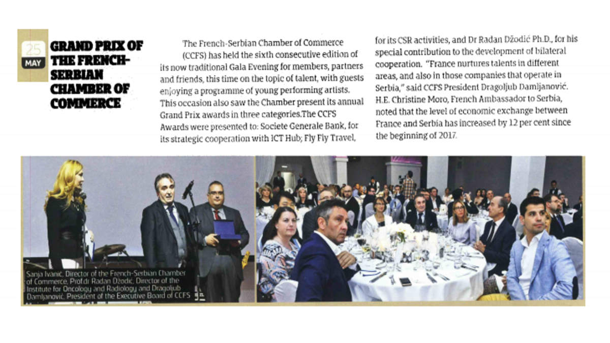 Poslovni časopis i naš član Diplomacy&Commerce objavio je u svom poslednjem broju članak o dobitnicima Gran Pri nagrada naše Komore za 2017. godinu. Dobitnici su :
