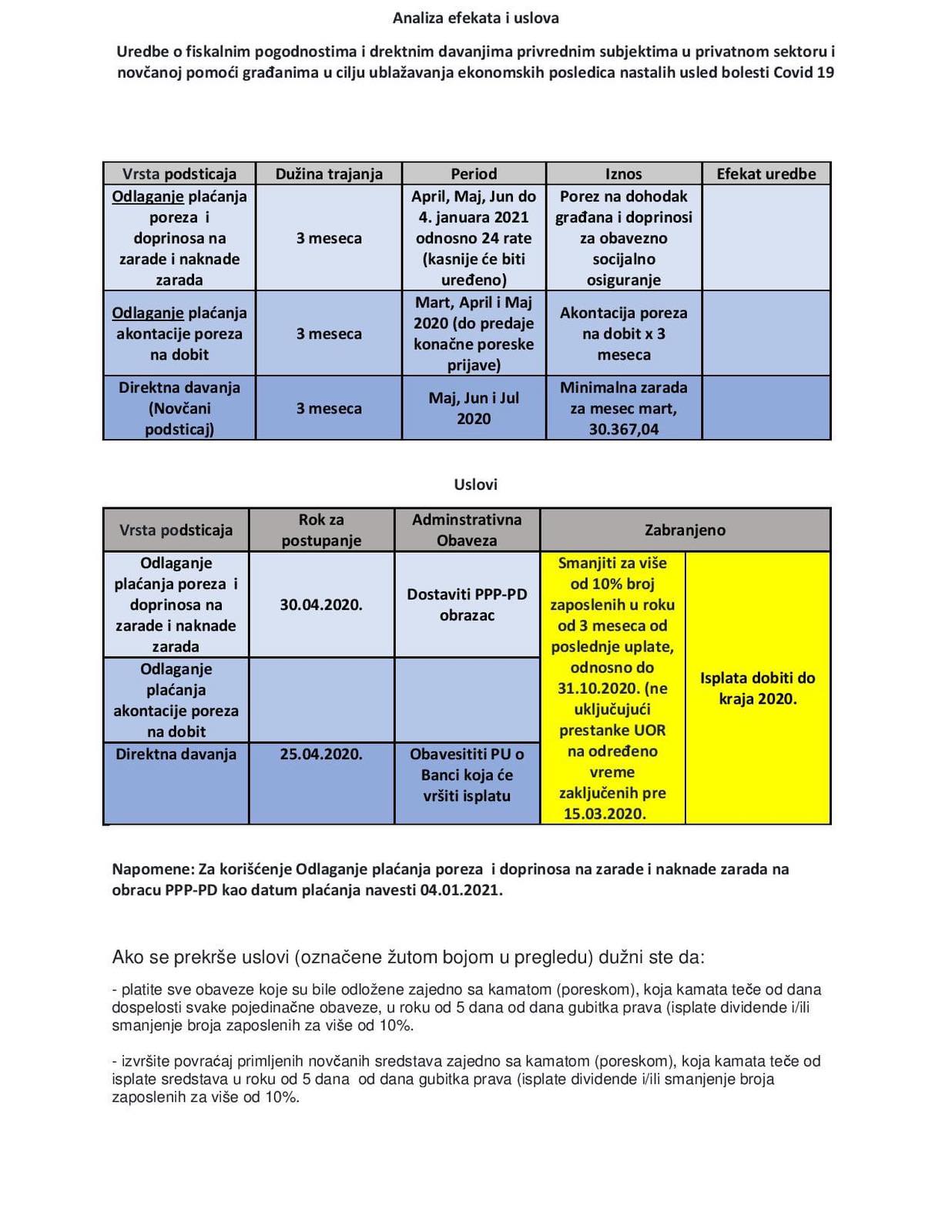 U cilju blagovremanog informisanja i ostvarivanja pomoći predviđene Uredbom o o fiskalnim pogodnostima i direktnim davanjima privrednim subjektima u privatnom sektoru i novčanoj pomoći građanima u cilju ublažavanja ekonomskih posledica nastalih usled bolesti COVID-19, u prilogu možete pronaći tekst Uredbe, uputstvo za primenu i najčešća pitanja i odgovore u vezi primene Uredbe. Takođe možete pronaći i u tabeli kratak pregled Efekti i uslovi Uredbe o fiskalnim pogodnostima I uslovima za ublazavanje ekonomskih posledica usled Covid 19.