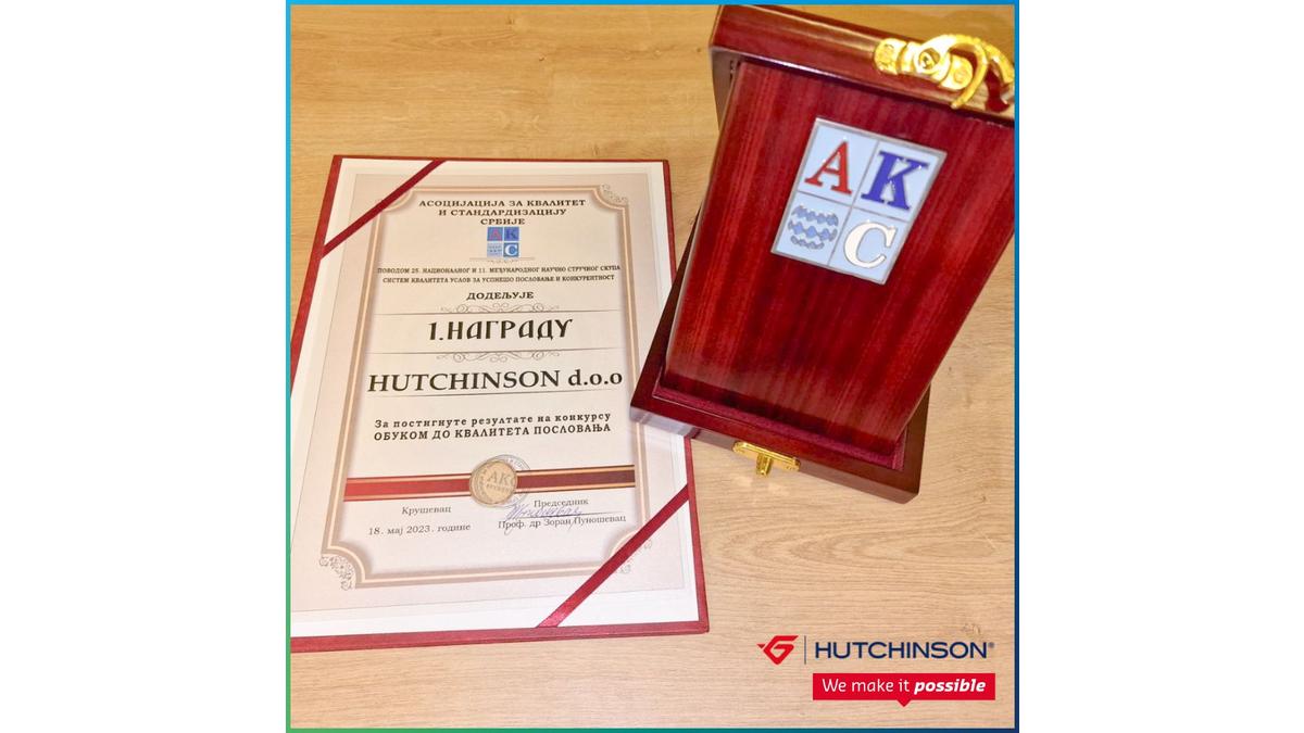 Međunarodna konferencija u okviru koje je održano takmičenje "Obuka za poslovni kvalitet" održano je na Kopaoniku. Tim našeg člana, komapanije Hutchinson, osvojio je prvo mesto. Nagradu su uručili predstavnik Ministarstva privrede i predsednik Udruženja za kvalitet i standardizaciju Srbije. Kontinuirani rad na poboljšanju kvaliteta i efikasnosti svih segmenata poslovanja doprineo je da tim našeg člana zauzme prvo mesto na takmičenju i osvoji nagradu koja će verujemo biti motivacija za buduće uspehe.