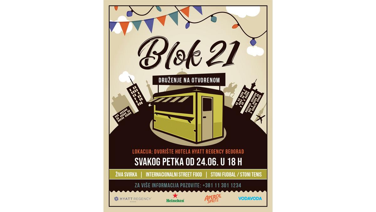 Hyatt Regency Beograd organizuje događaj pod nazivom Blok 21, svakog petka od 18.00 časova, počev od 24. juna 2022. godine, u dvorištu hotela.