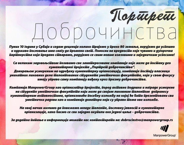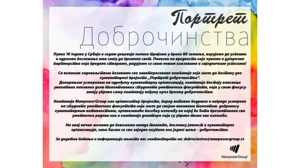 ManPower Group poziva sve zainteresovane kompanije koje žele da postanu deo humanitarnog projekta „Portret dobročinstva“ Doniranjem kompanije postaju vlasnici unikatnih likovnih dela talentovanih studenata umetničkih fakulteta, koja u svom fokusu imaju upravo samu kompaniju viđenu kroz prizmu dobročinstva.