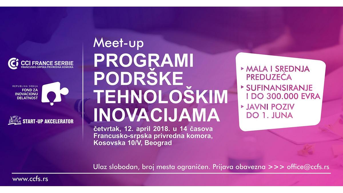 Francusko-srpska privredna komora i Fond za inovacionu delatnost organizovali su u dva navrata, zbog velikog interesovanja, Meetup na kojem su bili predstavljeni Programi podrške tehnološkim inovacijama, u prostorijama Biznis Centra Komore.
