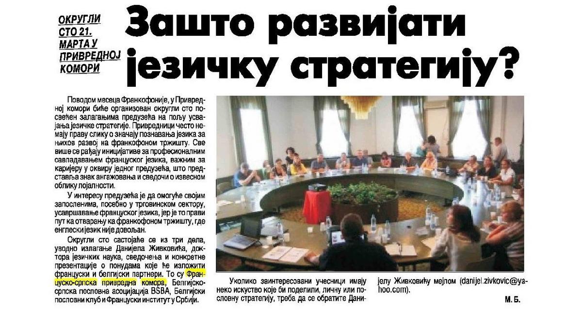 Narodne novine pisale su o seriji okruglih stolova na temu Privredne frankofonije koji će, u okviru Meseca frankofonije u martu, biti održani u Beogradu, Nišu i Novom Sadu. Francusko-srpska privredna komora će učestvovati u ovim debatama.