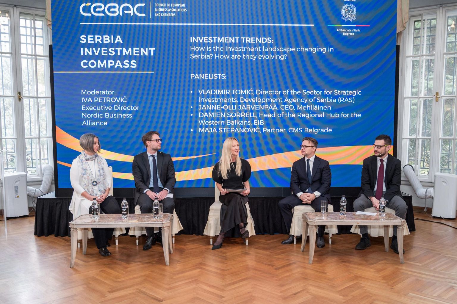 Konferencija „Serbia Investment Compass“ održana je 4. decembra u Ambasadi Italije u Beogradu, u organizaciji CEBAC saveta. Konferencija je okupila lidere iz srpskih i evropskih institucija, diplomatije, poslovnog sveta i finansijskog sektora, uz uvodna obraćanja Silvije Rakić (CEBAC), ambasadora EU u Srbiji Andreasa Von Bekerata i ambasadora Italije Luke Goria.