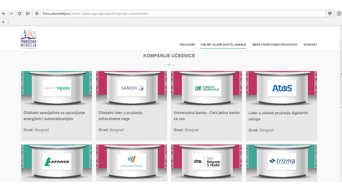 Na ovom sajmu učestvuje 10 velikih francuskih i drugih kompanija, među kojima su francuske grupe koje posluju u Srbiji - Schneider Electric, Sanofi Aventis, banka Crédit Agricole, Lafarge BFC, Atos IT solutions and Services, a tu su i ManpowerGroup, Sitel i Trizma. Pored toga, na sajmu učestvuju i Nacionalna služba za zapošljavanje, kao i Francusko-srpska privredna komora.