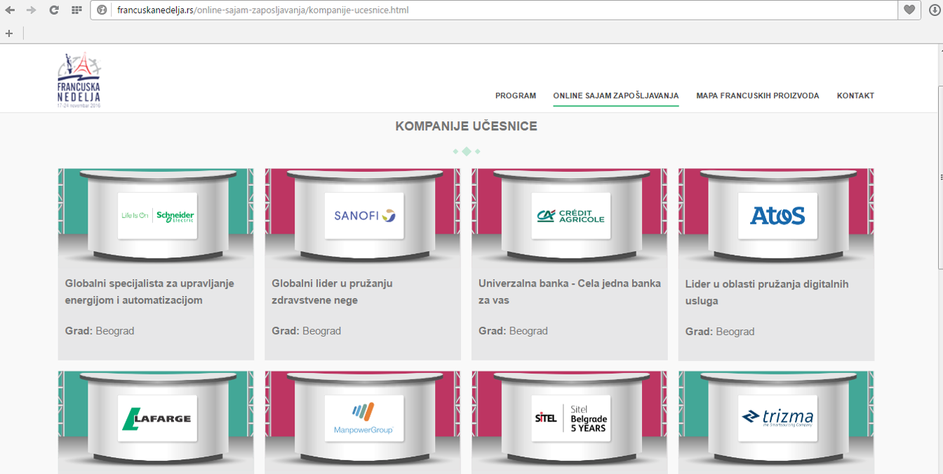 Danas je počeo sedmodnevni Onlajn sajam zapošljavanja Francusko-srpske privredne komore koji se održava u okviru manifestacije „Francuska nedelja“ od 17. do 24. novembra. Sajam je dostupan na internet adresi www.francuskanedelja.rs