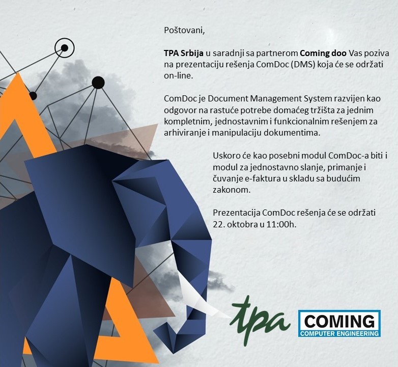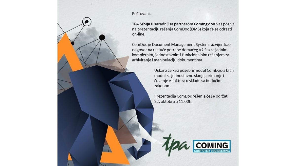 TPA Srbija, Član CCIFS, u saradnji sa partnerom Coming doo Vas poziva na prezentaciju rešenja ComDoc (DMS) koja će se održati on-line.