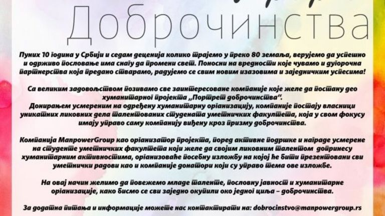 ManPower Group poziva sve zainteresovane kompanije koje žele da postanu deo humanitarnog projekta „Portret dobročinstva“ Doniranjem kompanije…